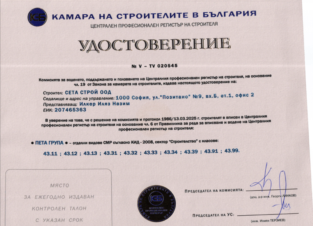 Удостоверения-Камарана на строителите-Сета Строй ООД